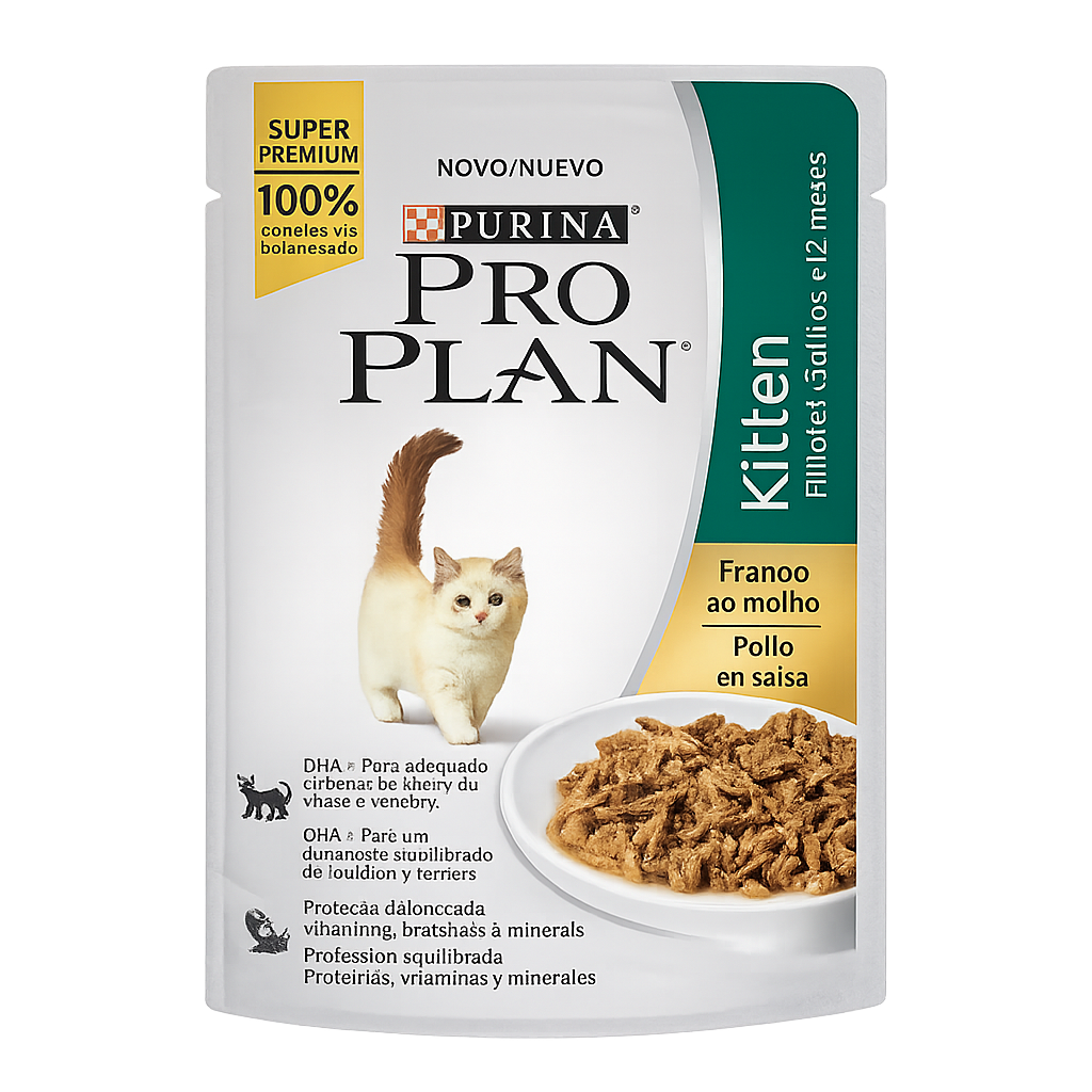 Alimento húmedo premium para gatitos con delicioso sabor a pollo, ideal para su crecimiento. Fortalece sus defensas, mejora su digestión y contribuye al desarrollo del cerebro y la visión, brindándole una nutrición completa y deliciosa.