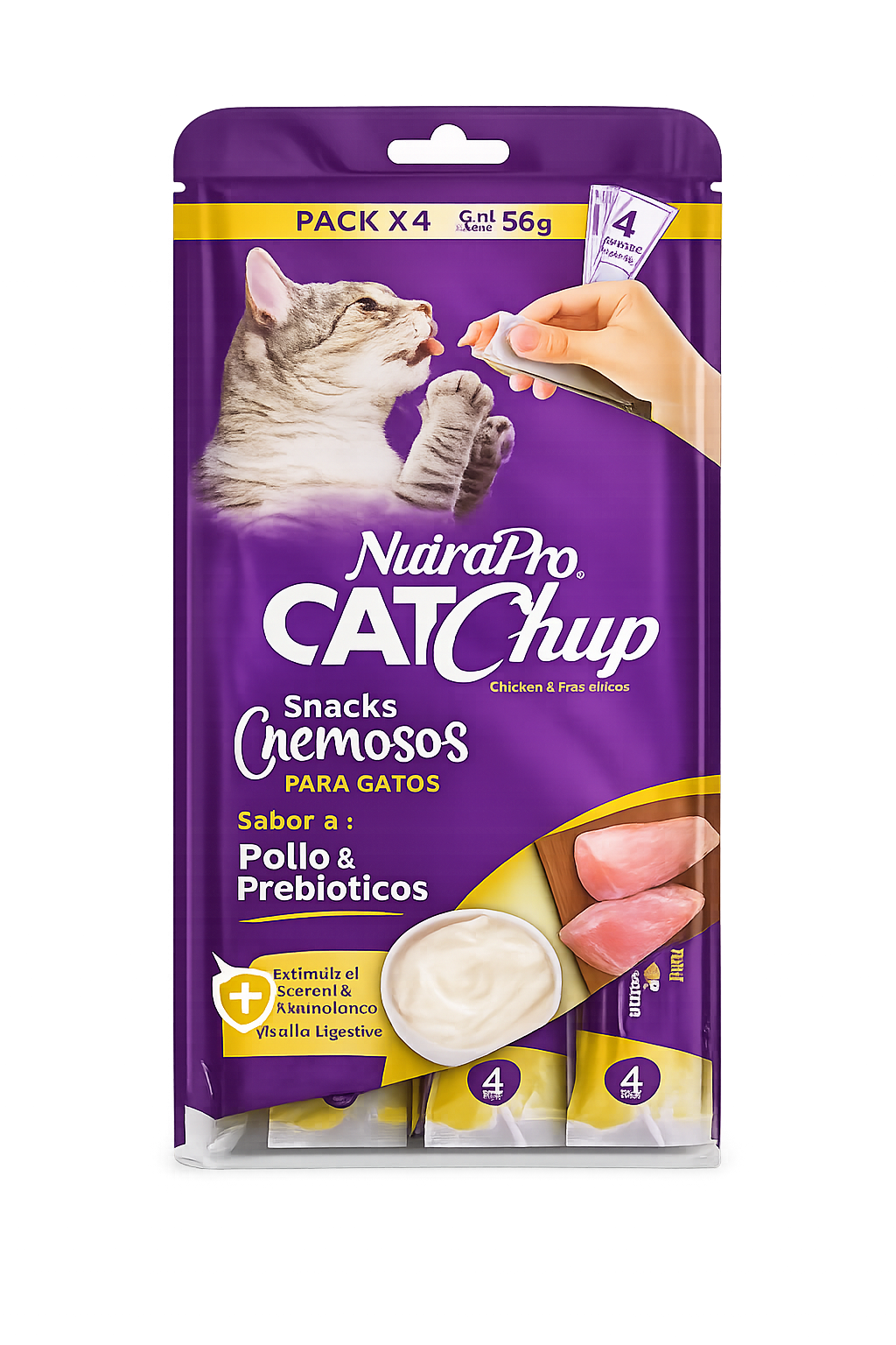 Snack cremoso para gatos con delicioso sabor a pollo, enriquecido con prebióticos que mejoran su digestión. Perfecto para consentirlo, hidratarlo y fortalecer su bienestar con cada porción.
