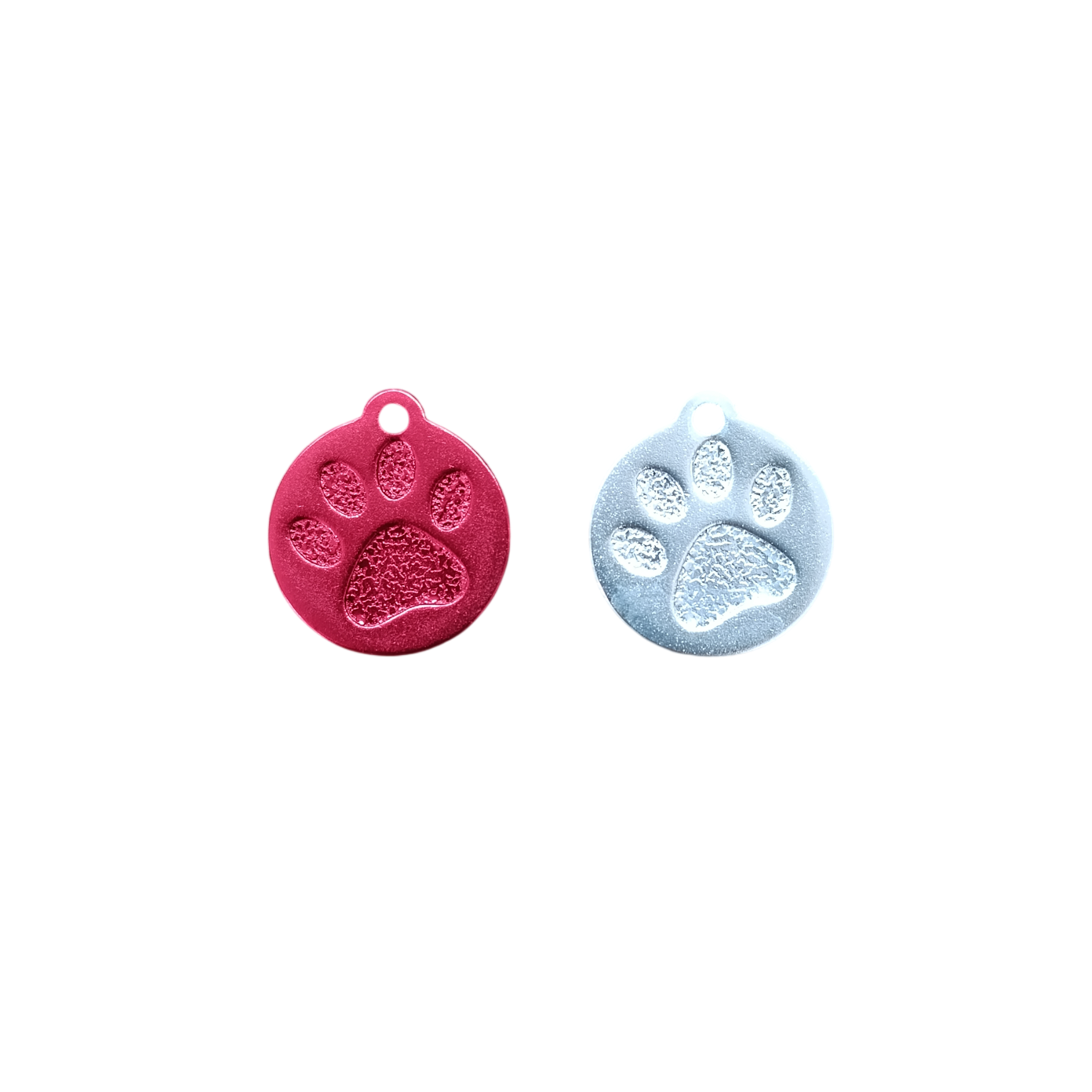 Placa identificadora para mascotas en forma de huella (pata), fabricada en aluminio ligero, resistente y anticorrosivo. Ideal para colocar en el collar, permite grabar el nombre y datos de contacto para una rápida identificación en caso de pérdida. Su tamaño mini la hace perfecta para perros pequeños y gatos, combinando seguridad y estilo en un accesorio práctico.