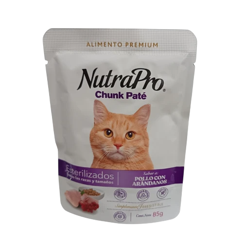Nutrapro gato Chunk Paté para esterilizados (85 g), alimento húmedo completo especialmente formulado para gatos esterilizados. Su receta con proteínas de calidad y arándanos ayuda a mantener un peso saludable, favorecer la salud urinaria y mejorar el estado del pelaje, además de aportar hidratación y alta palatabilidad.