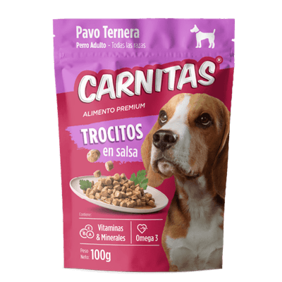 CARNITAS PERRO TROCITOS EN SALSA PAVO Y TERNERA 100GR